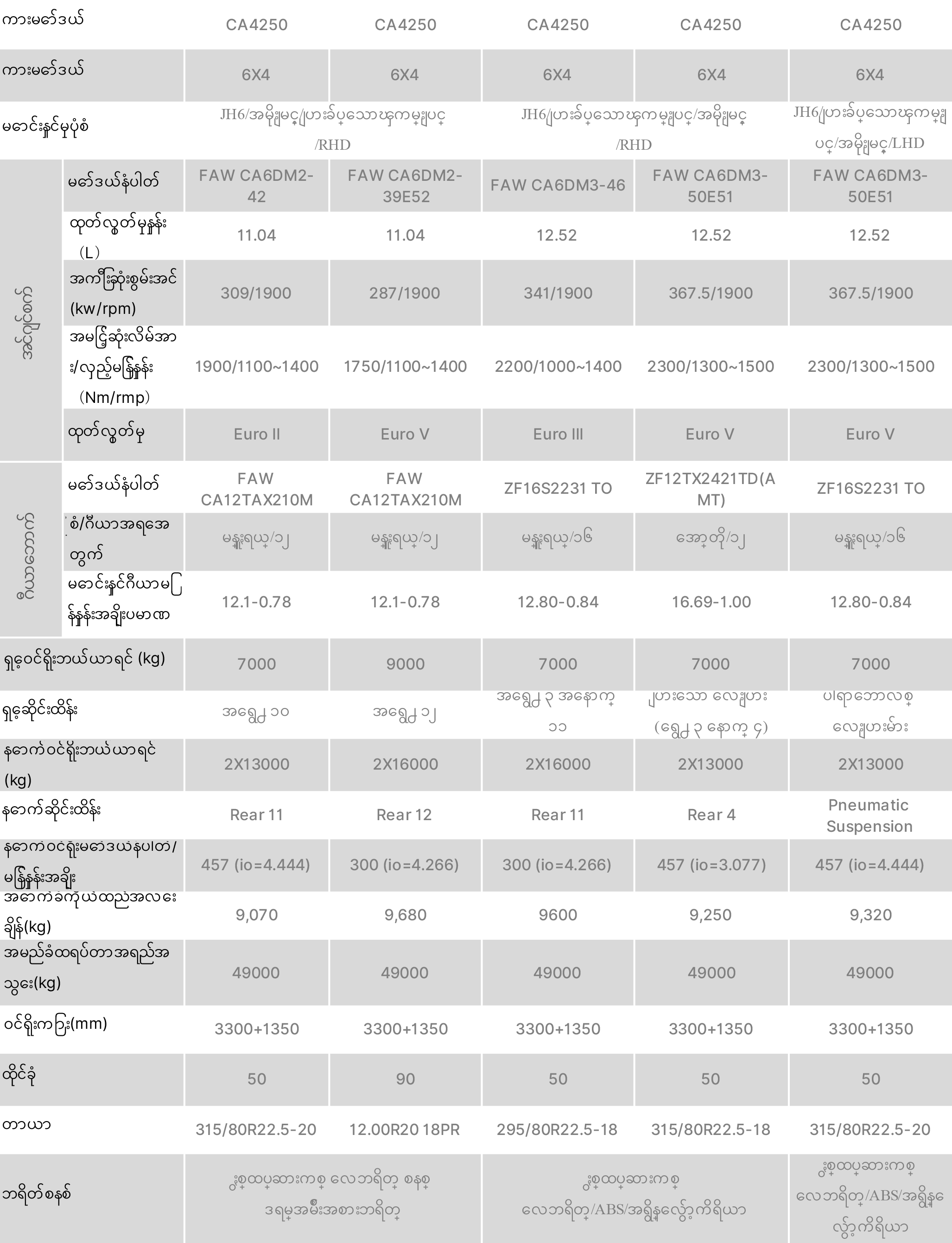 FAW TRUCKS J6P သည် တရုတ်နိုင်ငံ၏ အဆင့်မြင့် ထရပ်ကားထုတ်ကုန်ဖြစ်သည်။၎င်းသည်အလေးချိန်ပေါ့ပါး၊ ရေရှည်ခံ၊ အသုံးများခြင်း၊ ကီလိုမီတာ၁၀၀ လျှင် ဆီ၂ မှ ၃ လီတာ သက်သာစေခြင်း စသည့်ထူးခြားချက်ဖြင့်၊ သက်သောင့်သက်သာရှိ၊ လုံခြုံစိတ်ချရ၍၊ ဆီစားသက်သာသော လာဘ်ခေါ်စက်ယန္တရားအဖြစ်ဖန်တီး ထုတ်လုပ်ထားသည်။