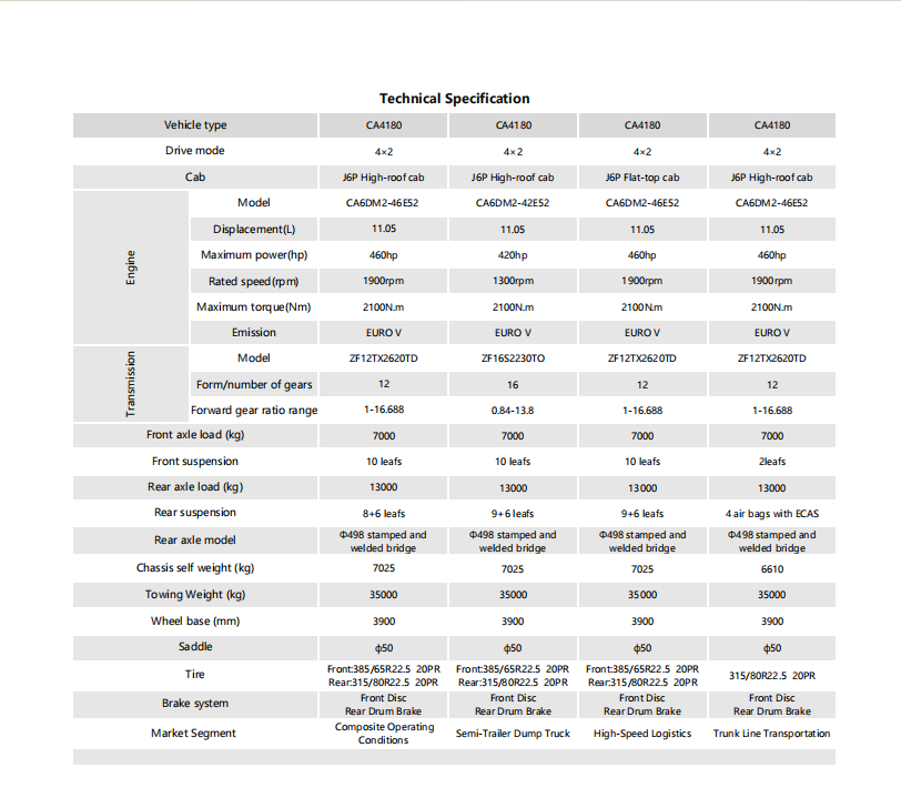 تحديث القوة: يمكن تركيب محرك 11 لتر بقوة 460 حصاناً، لمواصلة الريادة في تطور القوة؛ تحديث خفة الوزن: استخدام فرامل إسفينية + حوامل تعليق + ناقل حركة بعلبة ألومنيوم + محور من النوع 498، لتحقيق تحسين في خفة الوزن.